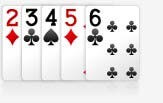 Kartu Straight (berurutan) : 5 kartu berurutan, contohnya 2 3 4 5 6 atau 10 J Q K As atau juga 5 6 7 8 9.